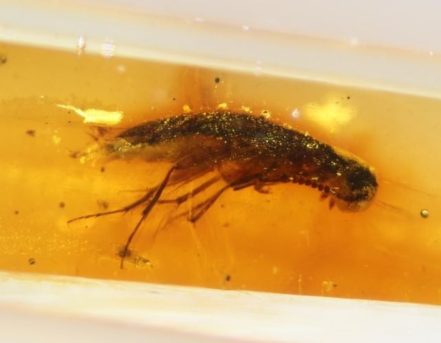 Kehribarın içinde en az beş farklı böcek takımına ait fosiller keşfedildi. Bu fosiller arasında sinek türleri, bir mantar böceği ve yaban arıları yer alıyor. Aynı zamanda örnek, bir örümcek ağı parçasını da içeriyor. İpliklerin düzeni, bu ağın modern çark örümceklerine benzer şekilde örülmüş olabileceğini düşündürüyor.