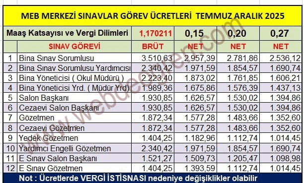Milli Eğitim Bakanlığı tarafından uygulanan yeni tarife kapsamında, görevde yükselme ve diğer sınavlarda görev alan öğretmen ve yöneticilere ödenecek sınav görev ücretleri şöyle: