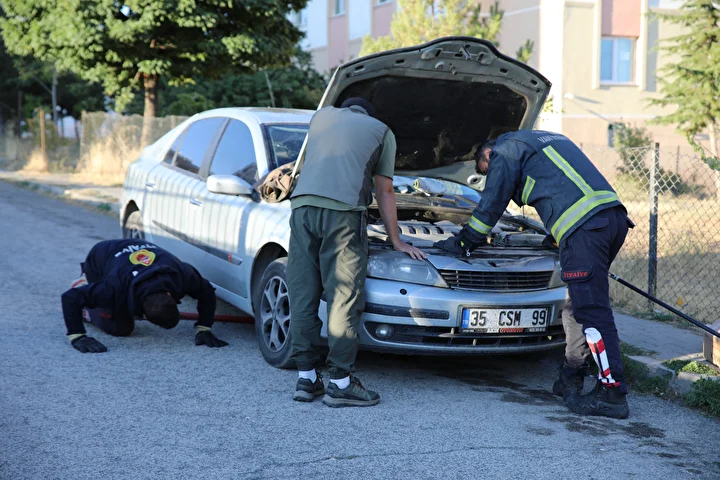 Deniz Çakır, su samurunun köpeklerden kaçarak önce otomobilin altına kaçtığını daha sonra da kaputa girdiğini söyledi.